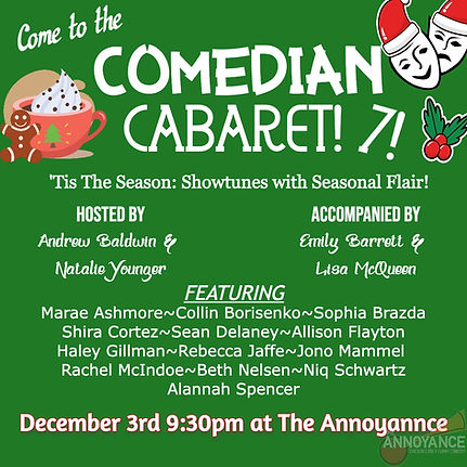 To make up for the days getting colder, Comedian Cabaret brings you another hot cast! Mark your calendars for December 3rd at 9:30pm for some seasonal show tunes. It will be snow much fun!
