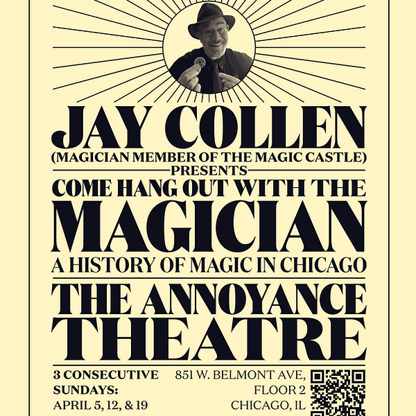 magicians. Audiences are limited to 30 per performance so that everyone can experience the magic up close. Audience members are encouraged to participate in discussion about the each trick and its Chicago history. Jay performs performs extensively, is the Senior Magic Teacher at Magic, Incorporated, has written acclaimed books on magic, and is a magician member of the famous Magic Castle in Hollywood.